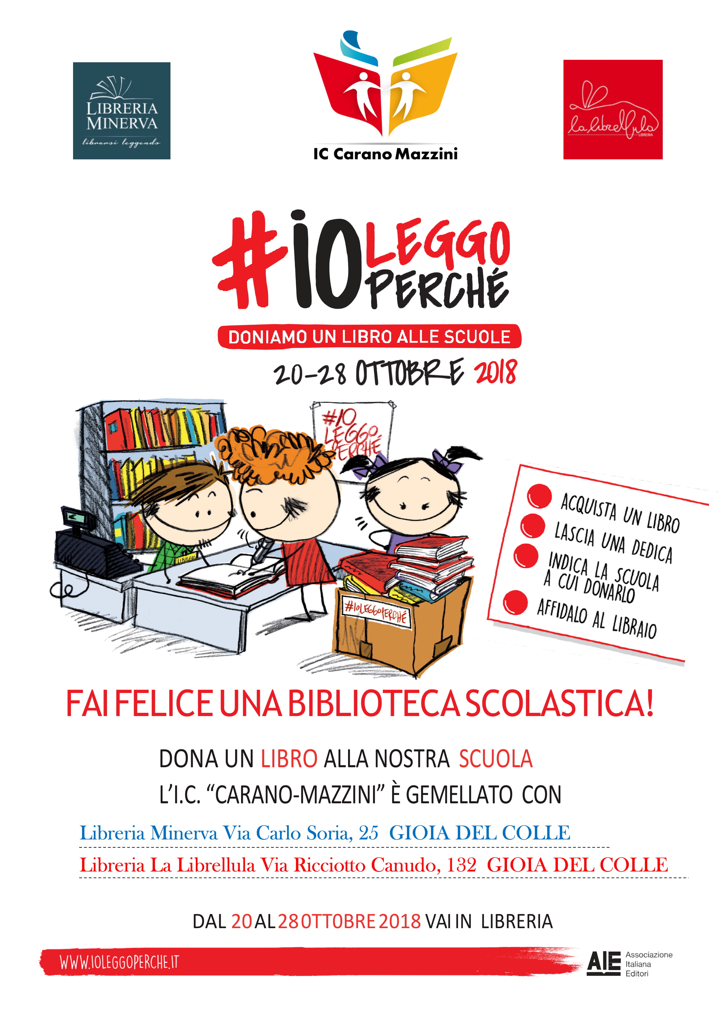 Da sabato 20 a domenica 28 ottobre 2018, recandosi nelle librerie di Gioia del Colle: “La Librellula” e “Minerva”, gemellate con il nostro Istituto, sarà possibile acquistare libri da donare alle scuole.